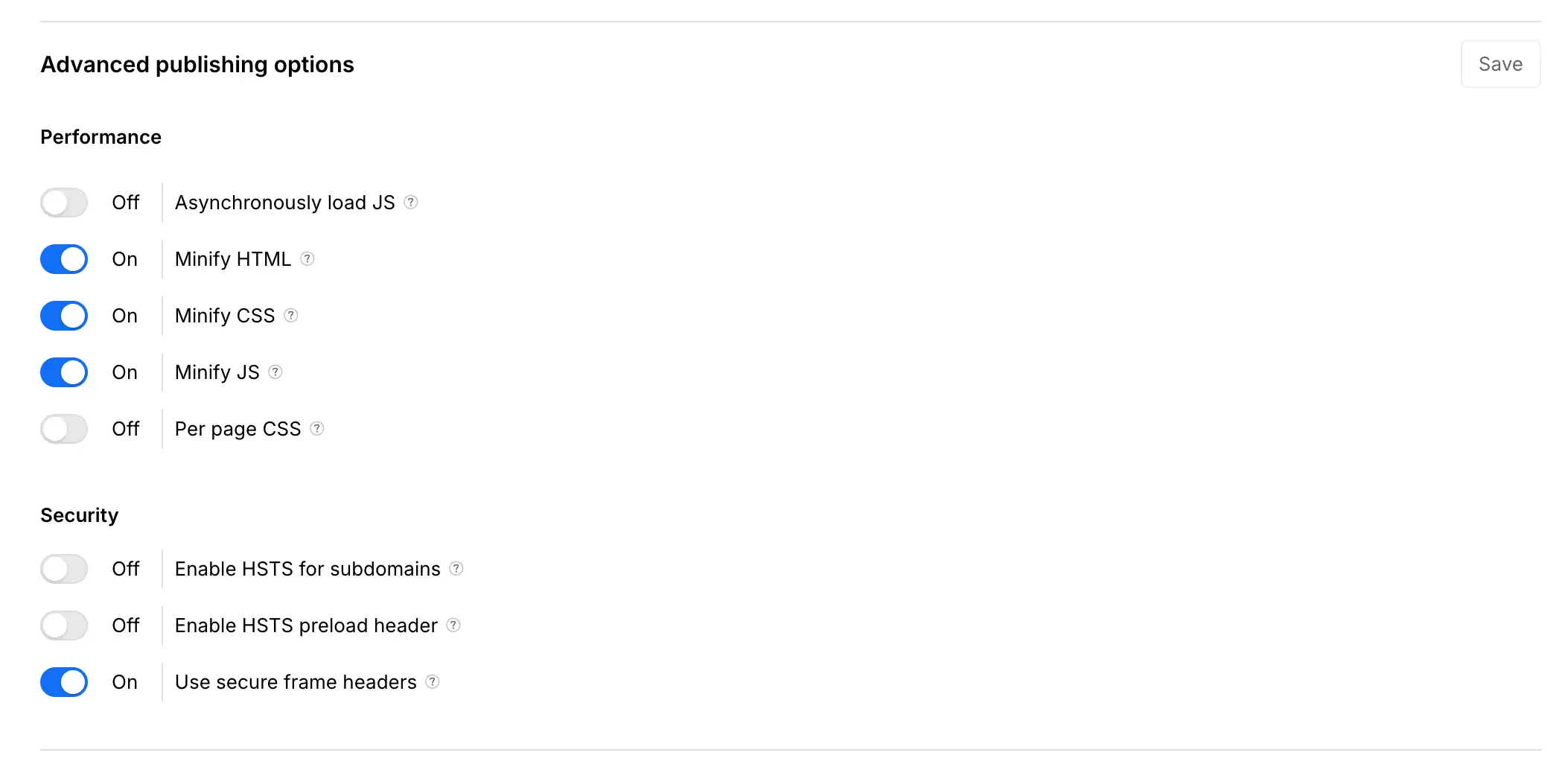 Webflow minifie automatiquement le JavaScript et le CSS à la publication.